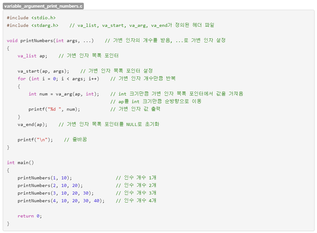 이 때, stdarg.h 헤더파일에서 va_list, va_start, va_arg, va_end 가 사용된다.