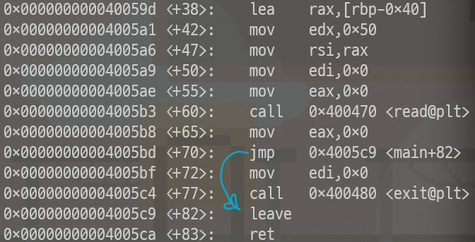 main+61 에서 leave 명령어로 스택을 정리하는데, leave 명령어는 mov rsp, rbp; pop rbp 으로 동작합니다.