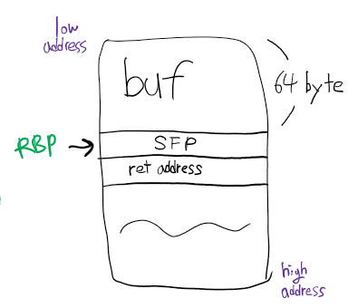 스택은 낮은주소부터 높은주소로 쓰여지기때문에, buf 의 크기를 넘겨 입력하면, SFP 와 RET 주소를 덮을 수 있어, 코드 흐름을 조작할 수 있습니다. 주로 SHELL을 실행시키는게 목적입니다.