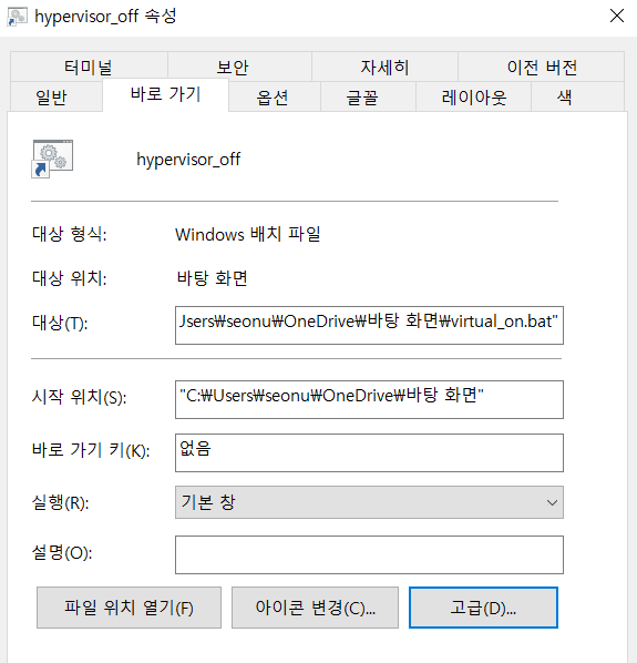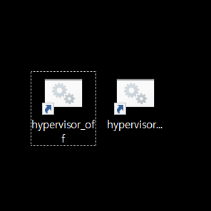 이렇게 바로가기파일 두 개가 생성되었습니다 ~ (저는 hypervisor_off, hypervisor_auto 으로 각각 만들었..? 는데 파일명이 잘리니 햇갈릴 수 있어서 그냥 on off 파일로 만들었습니다 (바로가기파일은 확장자 안붙이는겁니다)