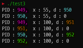 printf("PID : %ld, x : %d, d : %d\n",getpid(), x,d);