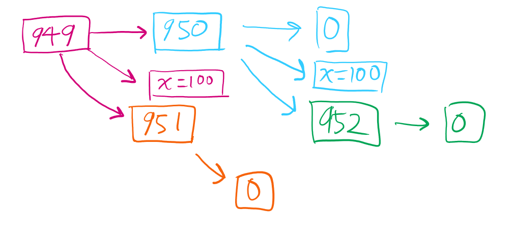 951 에서는 x=100 을 복사해서 가졌고, fork 함수가 한 번 실행되어 0 리턴받고 출력